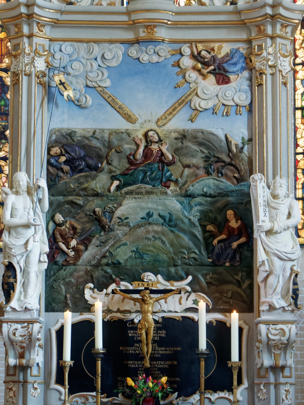 Im Mittelpunkt des Retabels steht die Szene im Garten Getsemane (Mk 14,32-42). In dieser Stunde großer Angst wird mit den Strahlen, die von oben links kommen, an Jesu Taufe erinnert (Mk 1,11), und damit an die Zusage, dass Gott an seinem Sohn Wohlgefallen hat. Der Strahl rechts weist mit dem Engel, der den Kelch in der Hand hält, schon auf die Heilsbedeutung des Abendmahls. Die Christen der Stadt Herzberg deuteten offensichtlich rückblickend ihr Geschick während des Krieges mit dem Schicksal Jesu im Garten Getsemane. Links die Figur Jesu mit Siegesfahne. Bisweilen wird diese Gestalt wegen der weisenden Geste ihrer rechten Hand auch für Johannes den Täufer (Wegbereiter Jesu) gehalten (Denkmaltopographie 7.1, 142). Diese Annahme wird man wegen der Siegesfahne, die sonst immer der auferstandene Christus trägt und der Inschrift im dazugehörigen Medaillon nicht halten können: »Jesus Gottes Vatters Ehr.« Auf der rechten Seite steht eine Mosefigur, leicht erkennbar an den Gesetzestafeln. Auf dem Medaillon: »Mose donre nur nicht mehr.« Die beiden Figuren repräsentieren die Stiftergestalten des Judentums (Mose) und des Christentums (Jesus). In der paulinischen Theologie, die für die Kirche seit der Reformation noch einmal besondere Bedeutung erlangt hatte, stehen sie für Gesetz und Evangelium: Mose für die Tora, Christus für die Freiheit vom Gesetz. Diese Engführung der jüdischen Tora auf »das Gesetz« wird dieser umfassenden jüdischen Lebenslehre in keiner Weise gerecht. Die Figur oben auf dem Altar kann auch nicht Gottvater sein (gegen Denkmaltopographie 7.1, 142). In dem aufgeschlagenen Buch steht das Bibelwort »Ich habe es von dem Herrn empfangen«, das in der Bibel Paulus zugeschrieben wird (1Kor 11,23). Dass die Figur mit Paulus zu identifizieren ist, schreibt auch Johann Schulze in seiner Chronik (Schulze, Johann Christian: Chronik der ehemaligen Chur- und jetzigen Kreisstadt Herzberg. Nachdruck der Ausgabe von 1842. Herzberg 2011, 221). Das Medaillon unter der Figur »Ich will meine Gelübde dem Herrn bezahlen für allen seinen Volk.« erinnert an Ps 22,26. Auf dem Altar stehen Kruzifix, Kerzen, und Blumen. Entscheidend ist das Kruzifix: Hier ist ein Ort, an dem nicht mehr geopfert werden kann. Christi Kreuz »besetzt« es. Die Verbindung zu Gott geschieht im Beten. Im Gottesdienstbuch, das auf dem Altar liegt, sind alle Gebete und Gesänge für den gottesdienstlichen Gebrauch enthalten. Auf manchen Altären, vor allem in den Dörfern, liegen anstelle dessen Bibeln. Das geht auf eine unter Friedrich-Wilhelm III. eingeführte Tradition zurück, und die den Altar als Ort der Darstellung der zwei refomatorischen Grundsäulen »solus Christus« (Kruzifix) und »sola scriptura« (Bibel) inszeniert. |