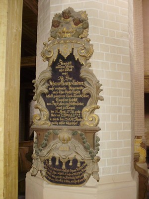 Am letzten Pfeiler auf der Südseite befindet sich dieses Grabmal: Herrn Johann George Lindner, Bürgermeister, Steuerbeauftragter, von Beruf Seifensieder 16. April 1729 - 22. Oktober 1772 1772 Sandstein Krone und Engelsköpfe über Vitentafel |